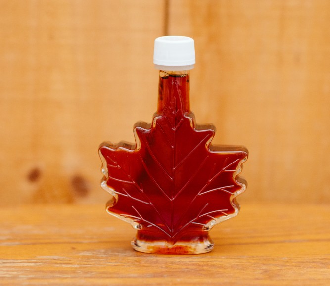 Beautiful leaf-shaped bottle with 1.7 fl oz of pure maple syrup